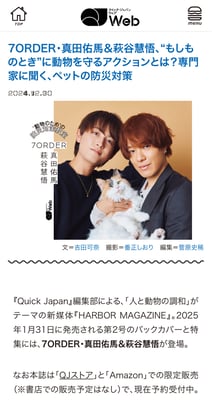 太田出版様からご依頼を受け、動物のための防災対策教室『”もしものとき”に動物を守るアクションとは?専門家に聞くペットの防災対策』アイドルグループ (7ORDER・真田佑馬さん&萩谷慧悟さん)とリモート対談させていただきました。